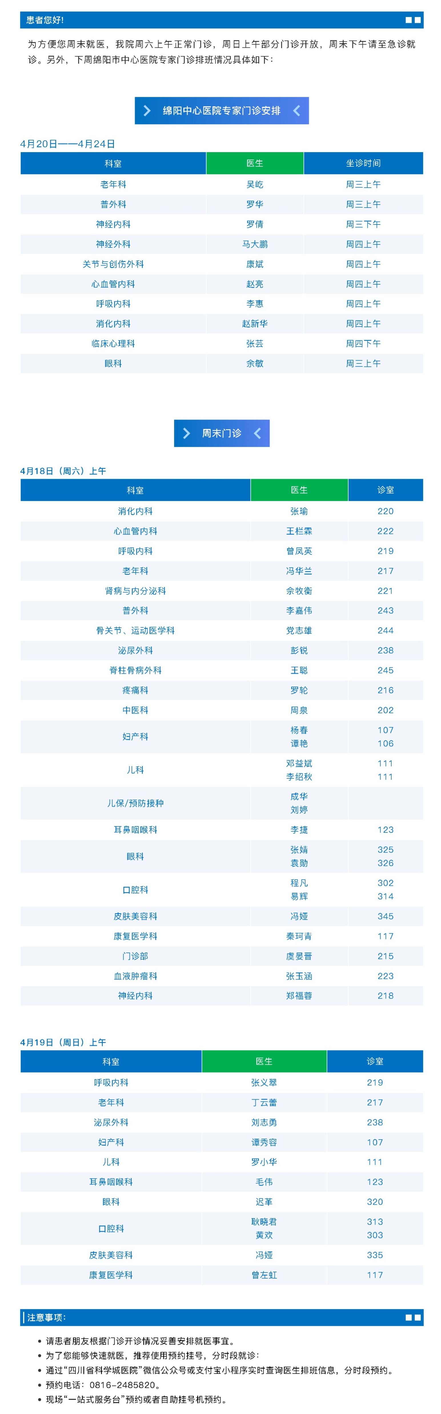 绵阳中心医院专家下周门诊(4.20-4.24)丨周末门诊排班情况