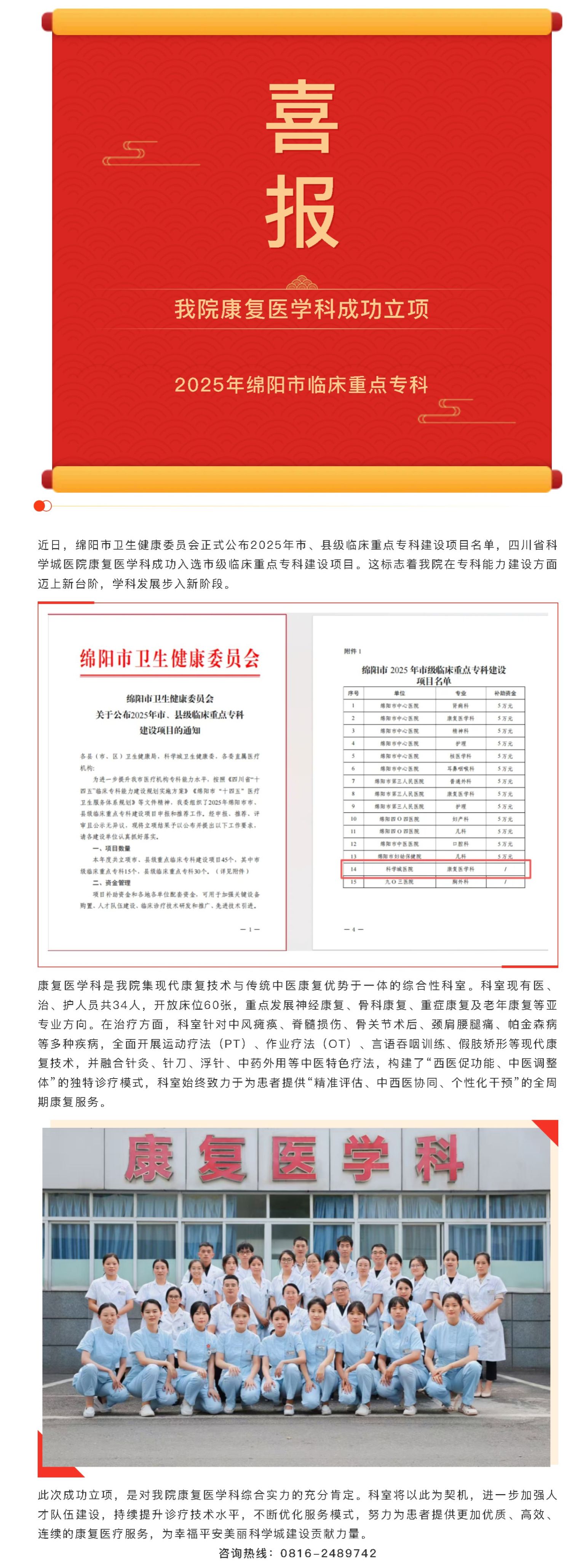 赞!我院康复医学科成功立项2025年绵阳市临床重点专科