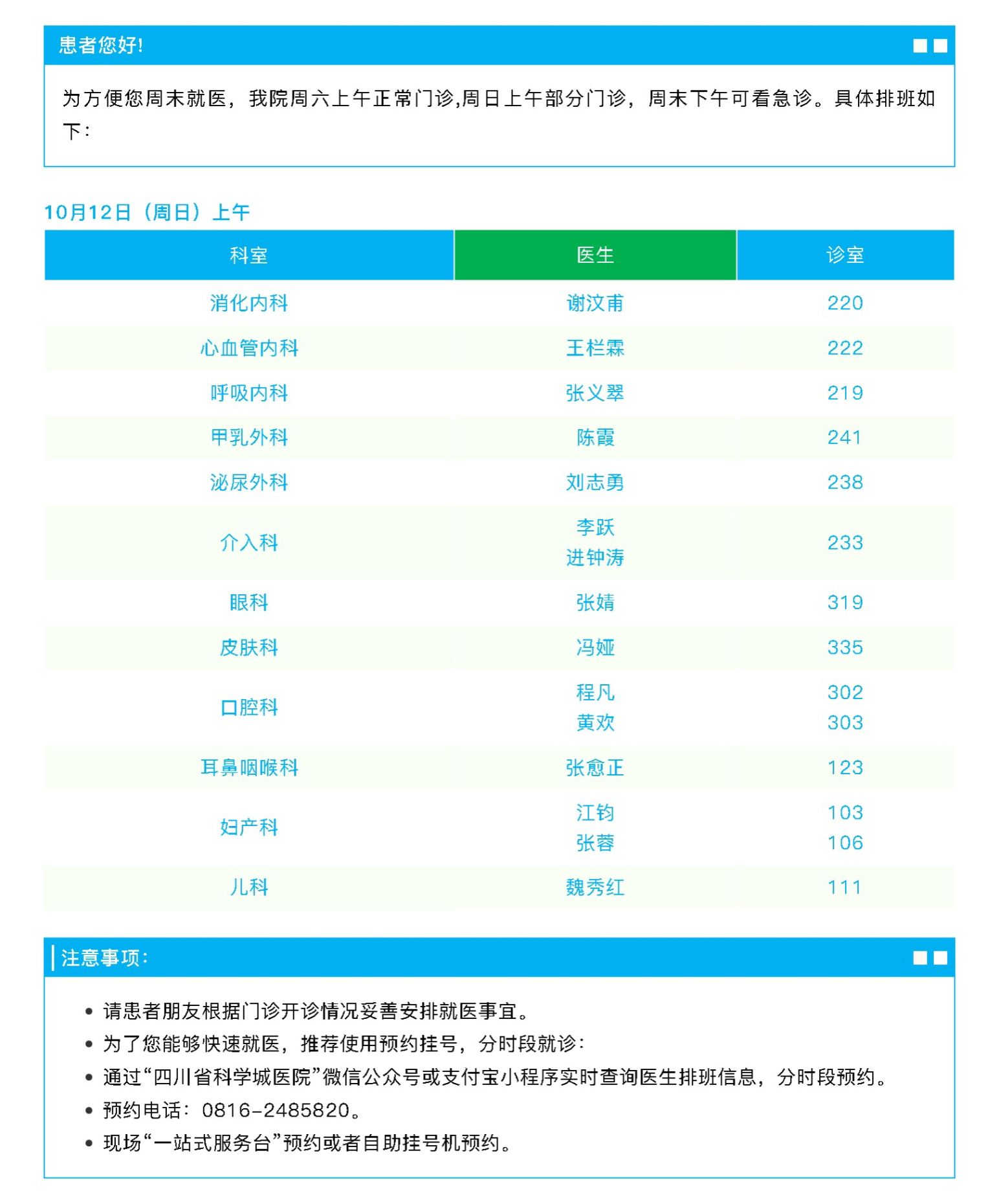 周末门诊丨10月12日门诊排班情况